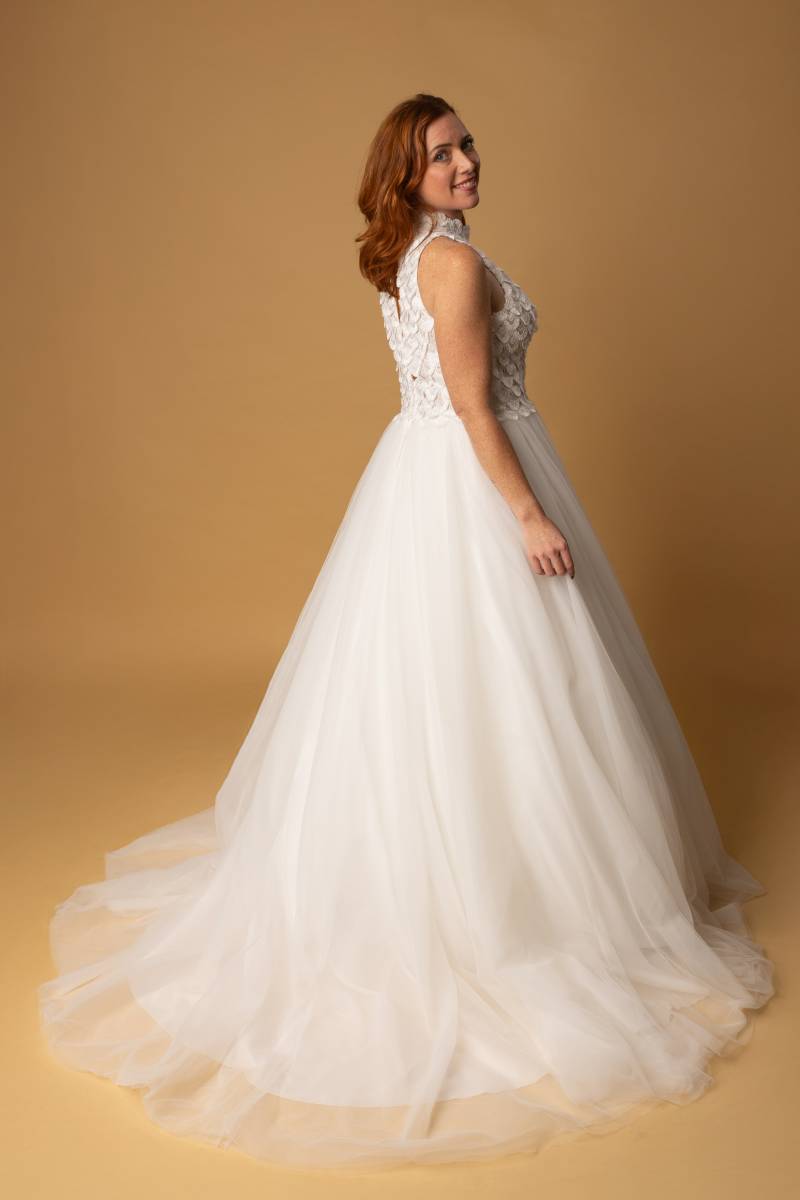Le modèle Anastasia est une robe de mariée à la coupe princesse et de style champêtre.
