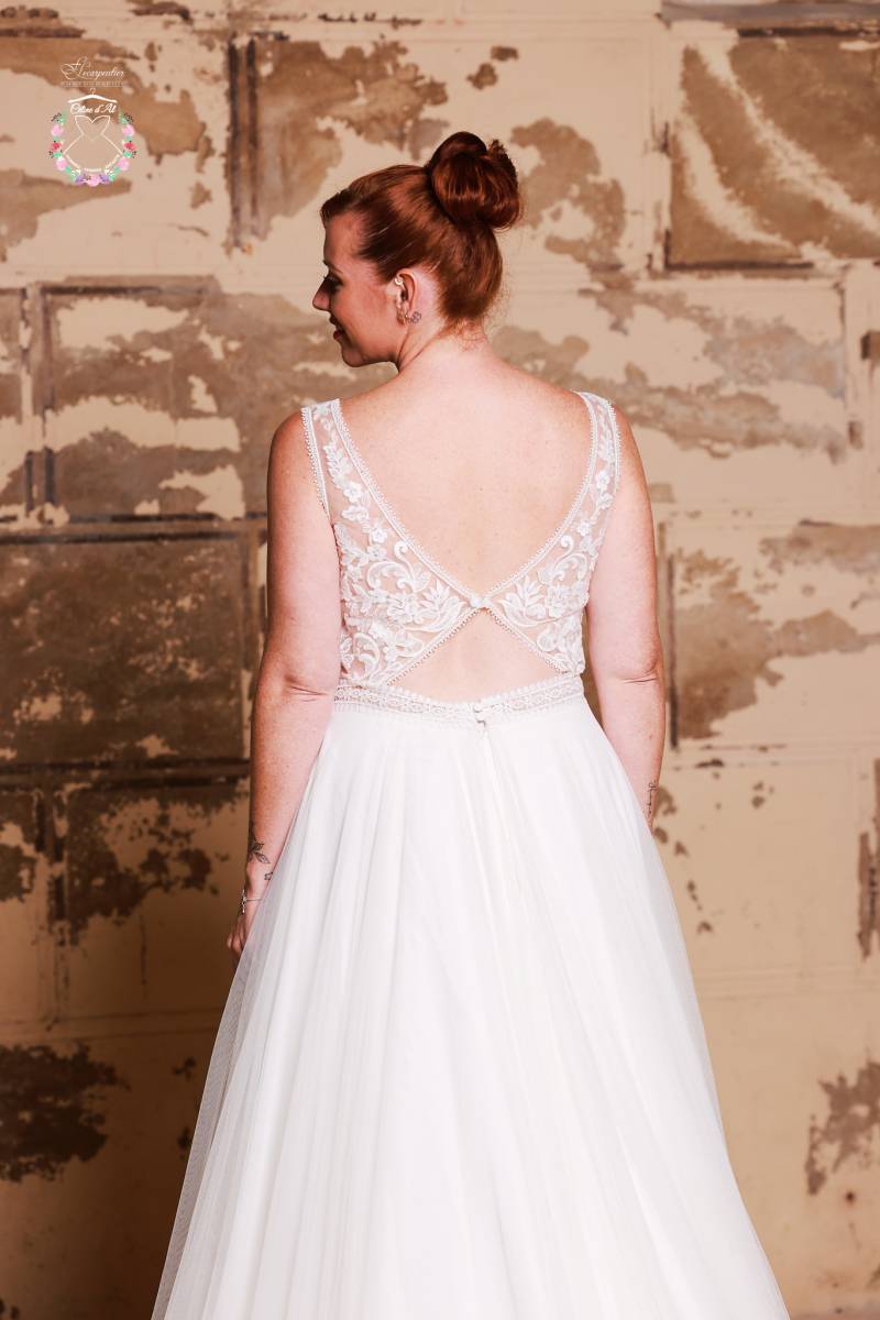 La jupe toute en tulle souple, accompagnée de sa traîne, apportera légèreté et fluidité à votre style champêtre.