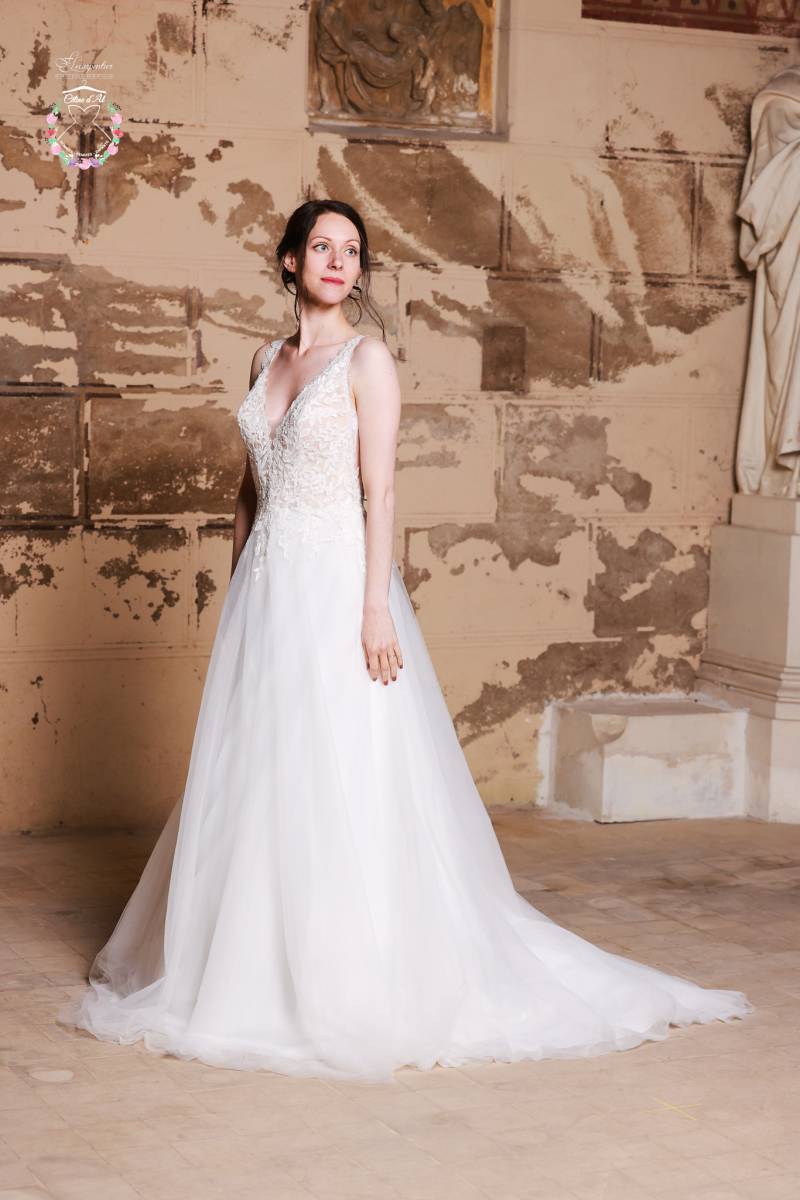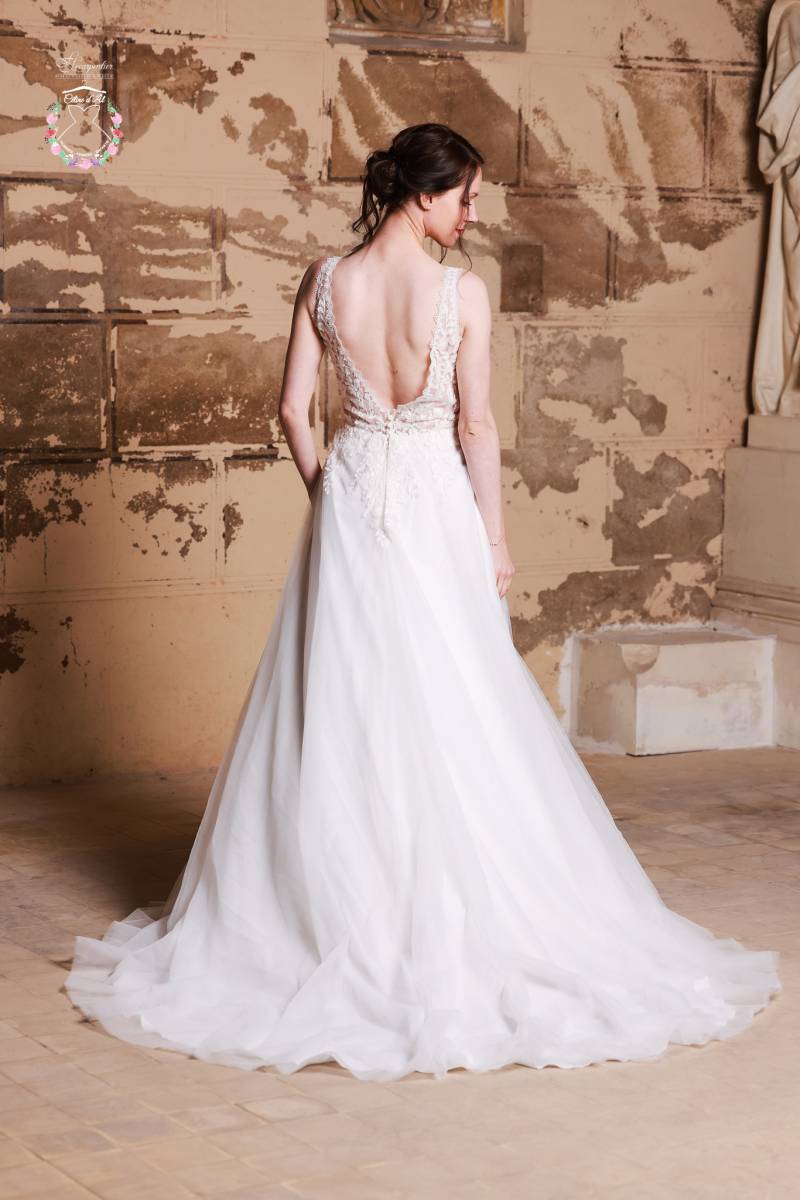 Pour la jupe toute en tulle, elle débutera par quelques descentes de dentelles sous la taille, et se terminera par une jolie traîne légère et fluide.