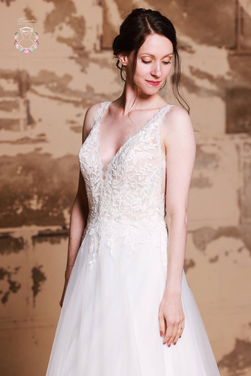 Le modèle Brunella est une robe de mariée à la coupe trapèze et de style champêtre.