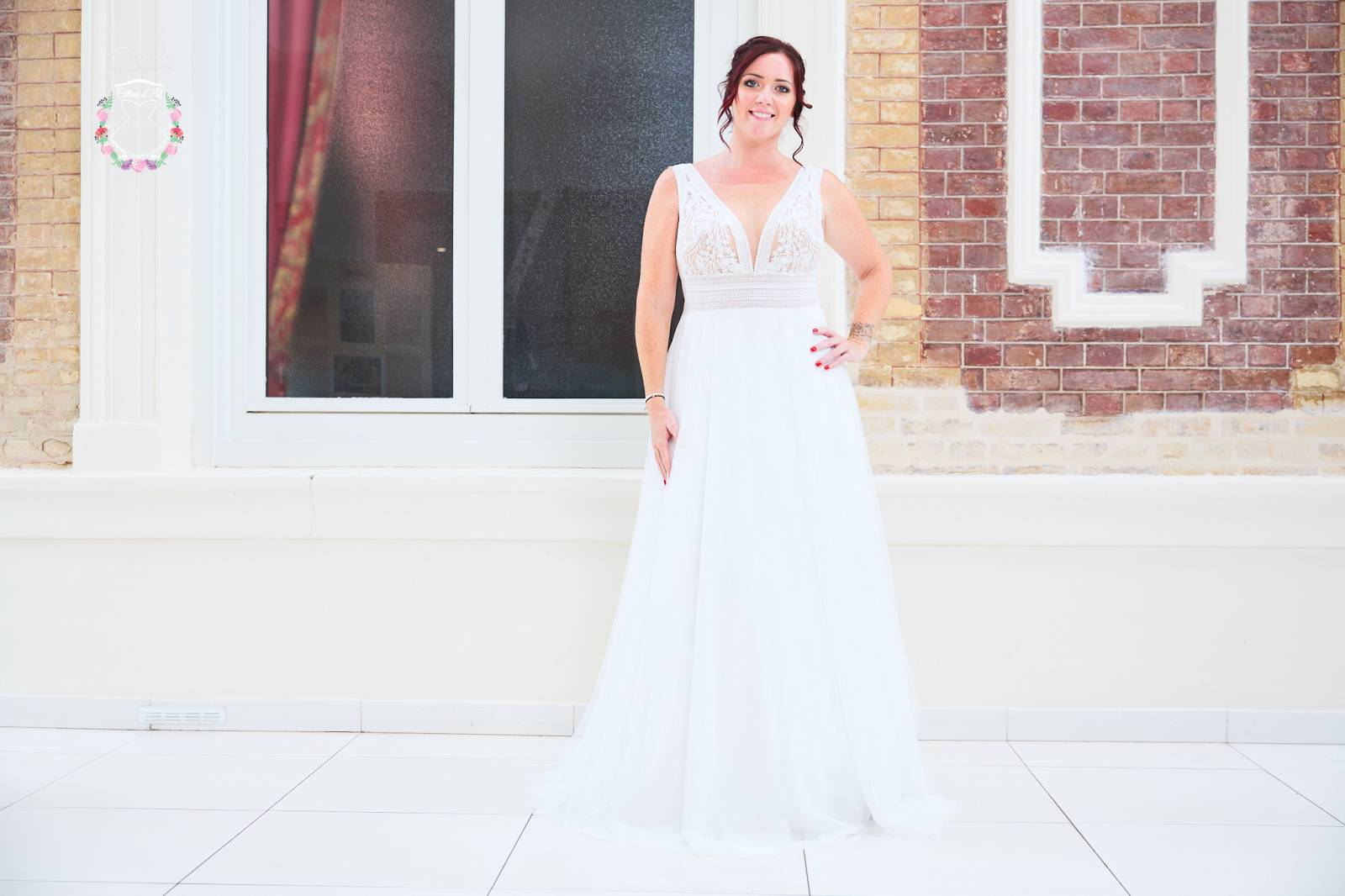 Le modèle Caitlyn est une robe de mariée à la coupe trapèze avec décolleté V devant et dans le dos.
