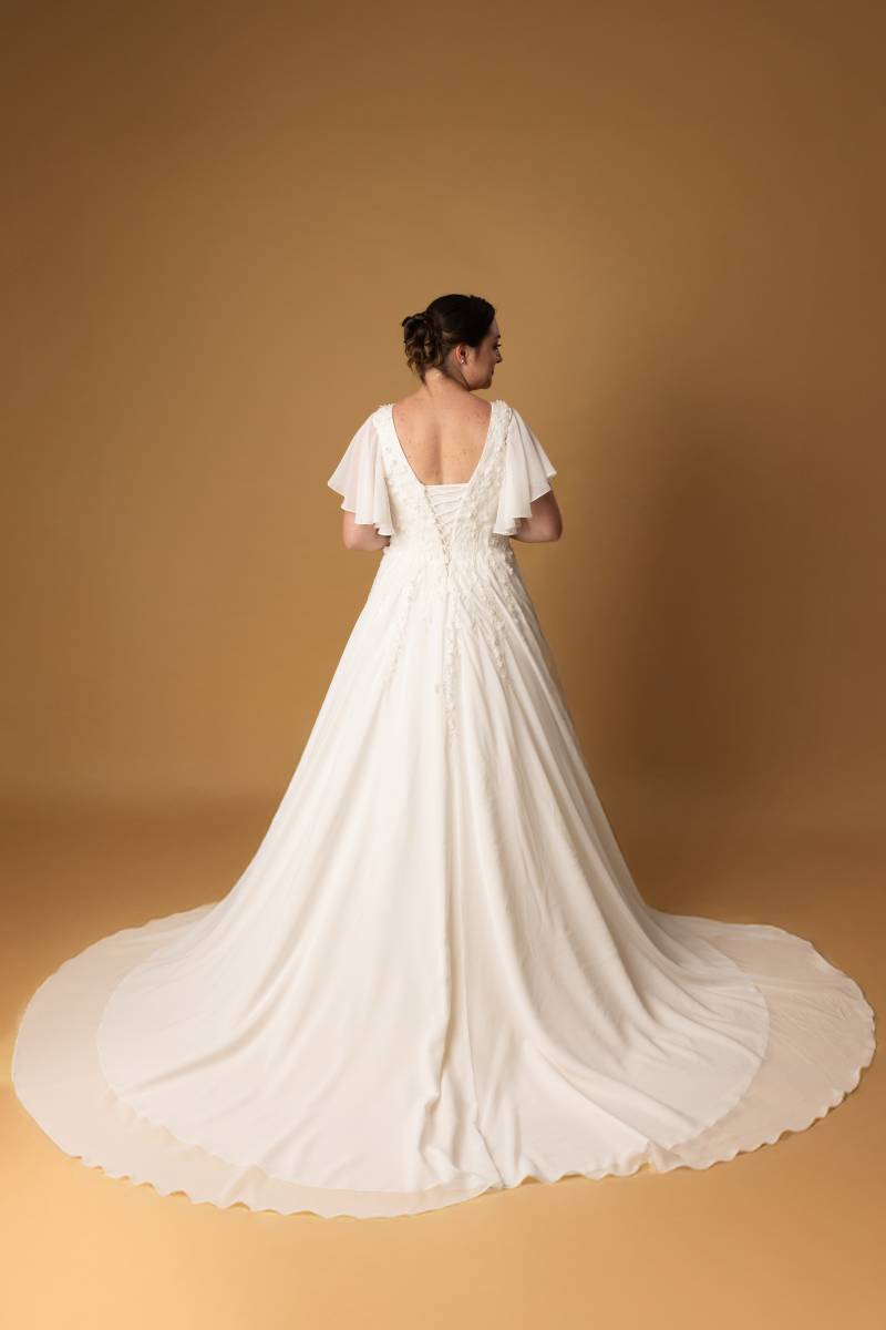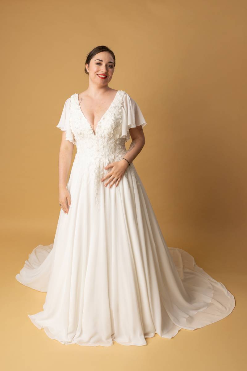 Le modèle Candice est une robe de mariée à la coupe trapèze et de style champêtre.