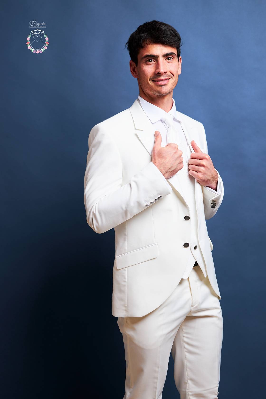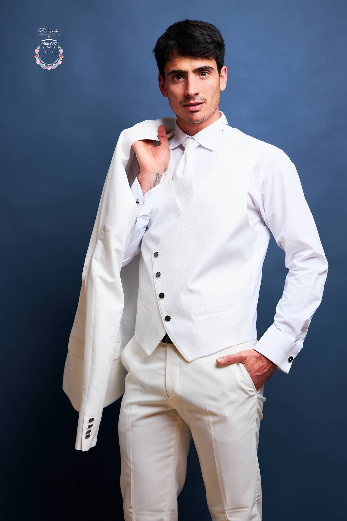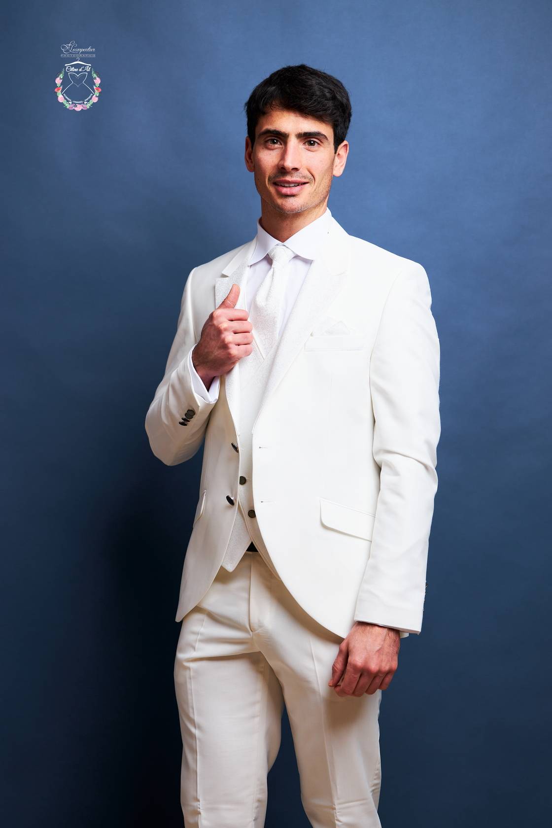 Il est composé de 5 pièces comprenant la veste, le pantalon, le gilet, la lavallière et la pochette.