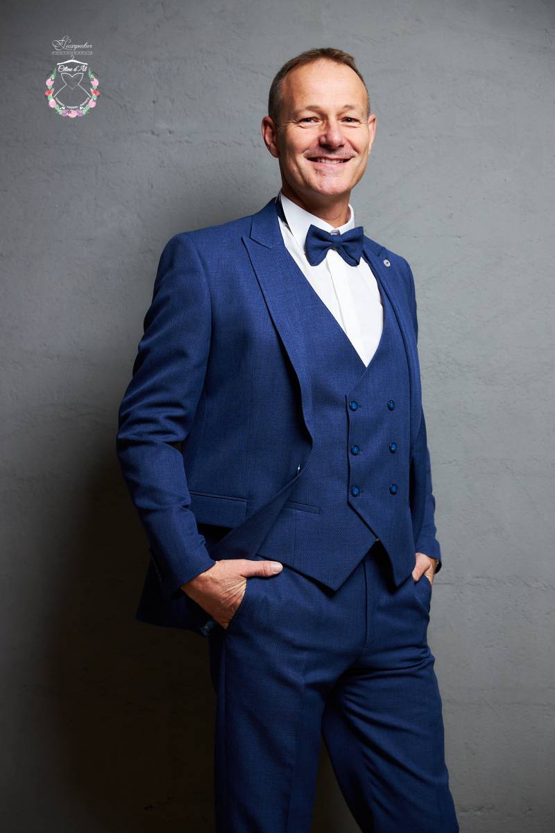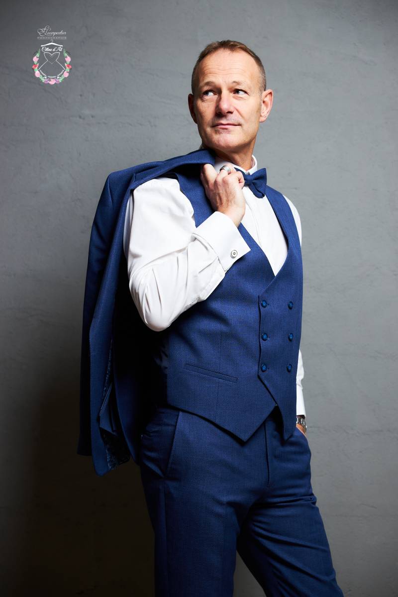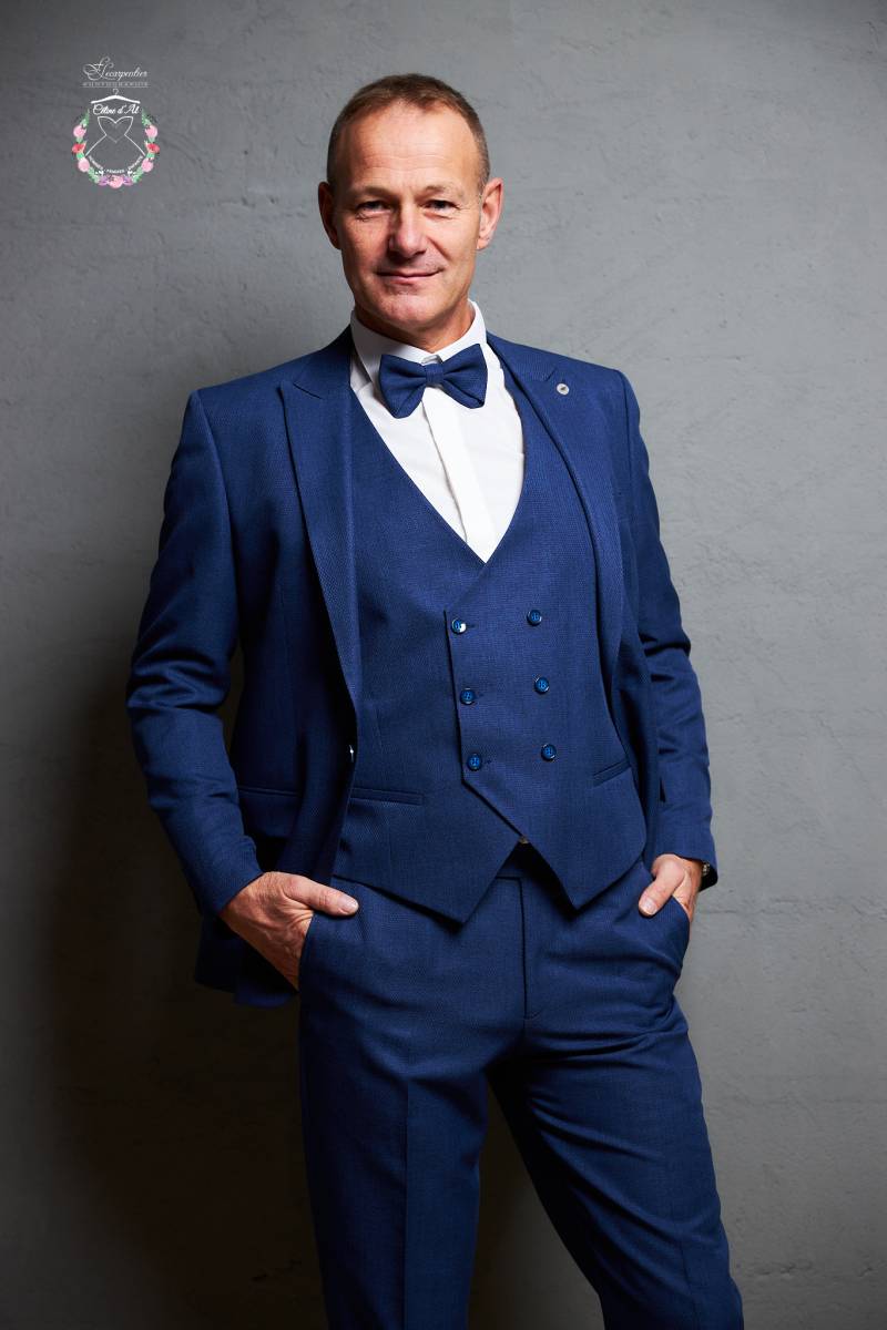 Il est composé de 4 pièces comprenant la veste, le pantalon, le gilet et le noeud papillon.