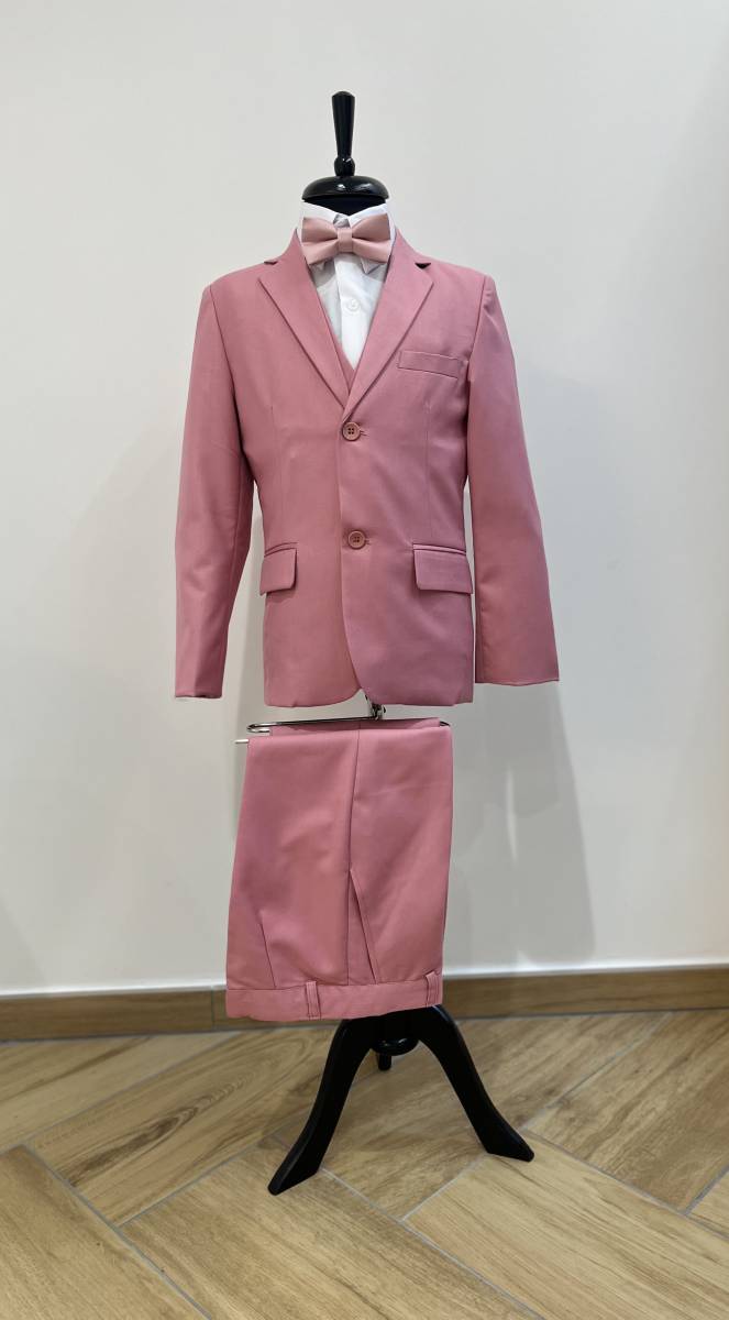 Il est composé de 5 pièces comprenant la veste, le pantalon, le gilet, la chemise et le noeud-papillon.