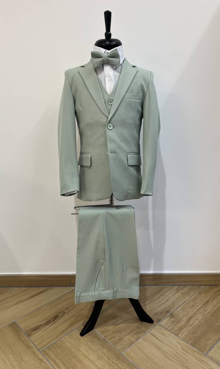 Il est composé de 5 pièces comprenant la veste, le pantalon, le gilet, la chemise et le noeud-papillon.