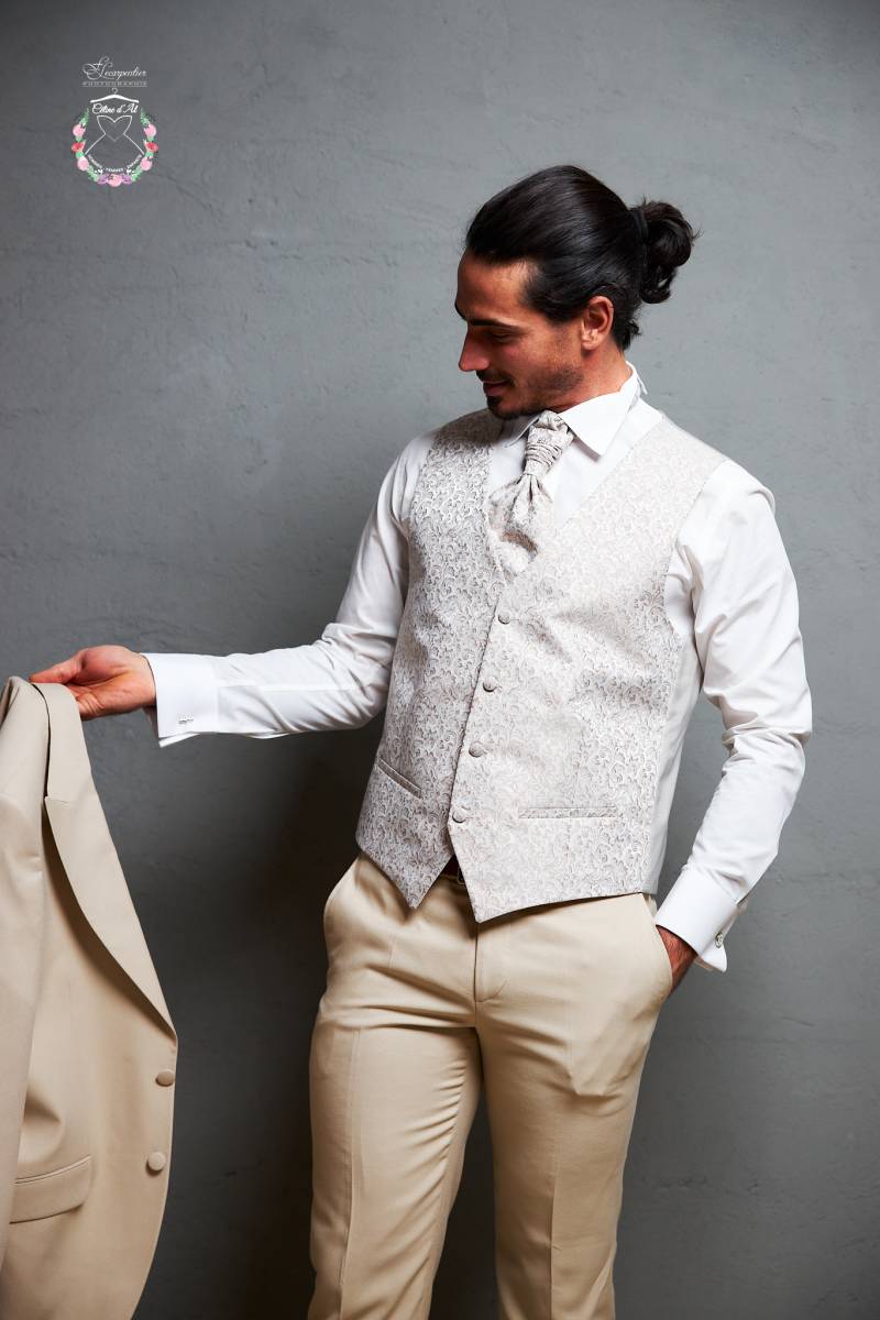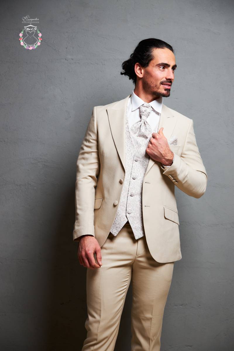 Il est composé de 5 pièces comprenant la veste, le pantalon, le gilet, la lavallière et la pochette.