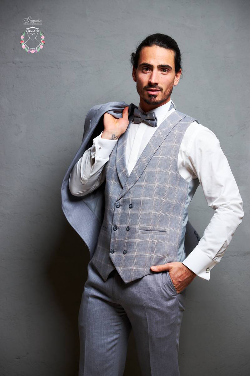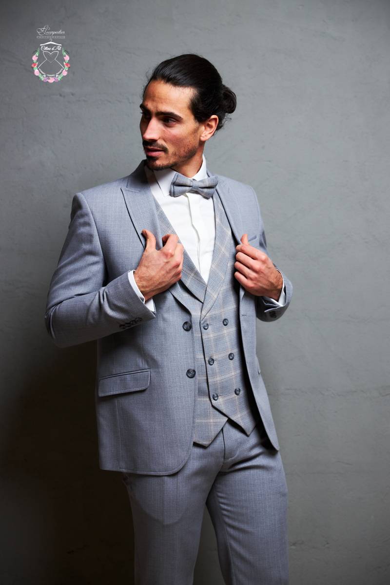 De couleur gris, il vous propose un gilet et un noeud papillon à carreaux.