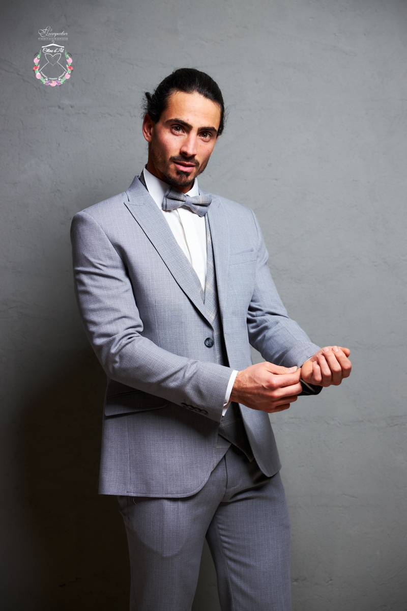 Il est composé de 5 pièces comprenant la veste, le pantalon, le gilet, le noeud papillon et la pochette.