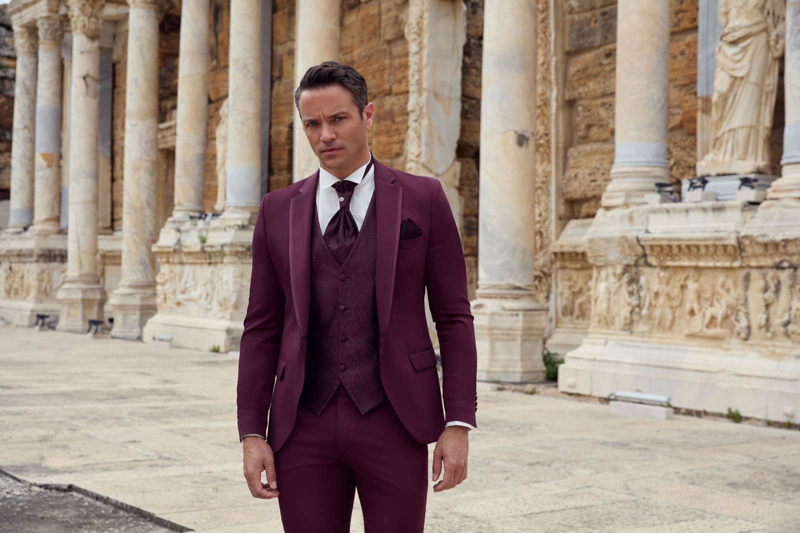 Il est composé de 5 pièces comprenant la veste, le pantalon, le gilet, la lavallière et la pochette.