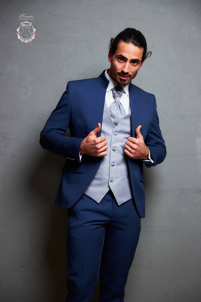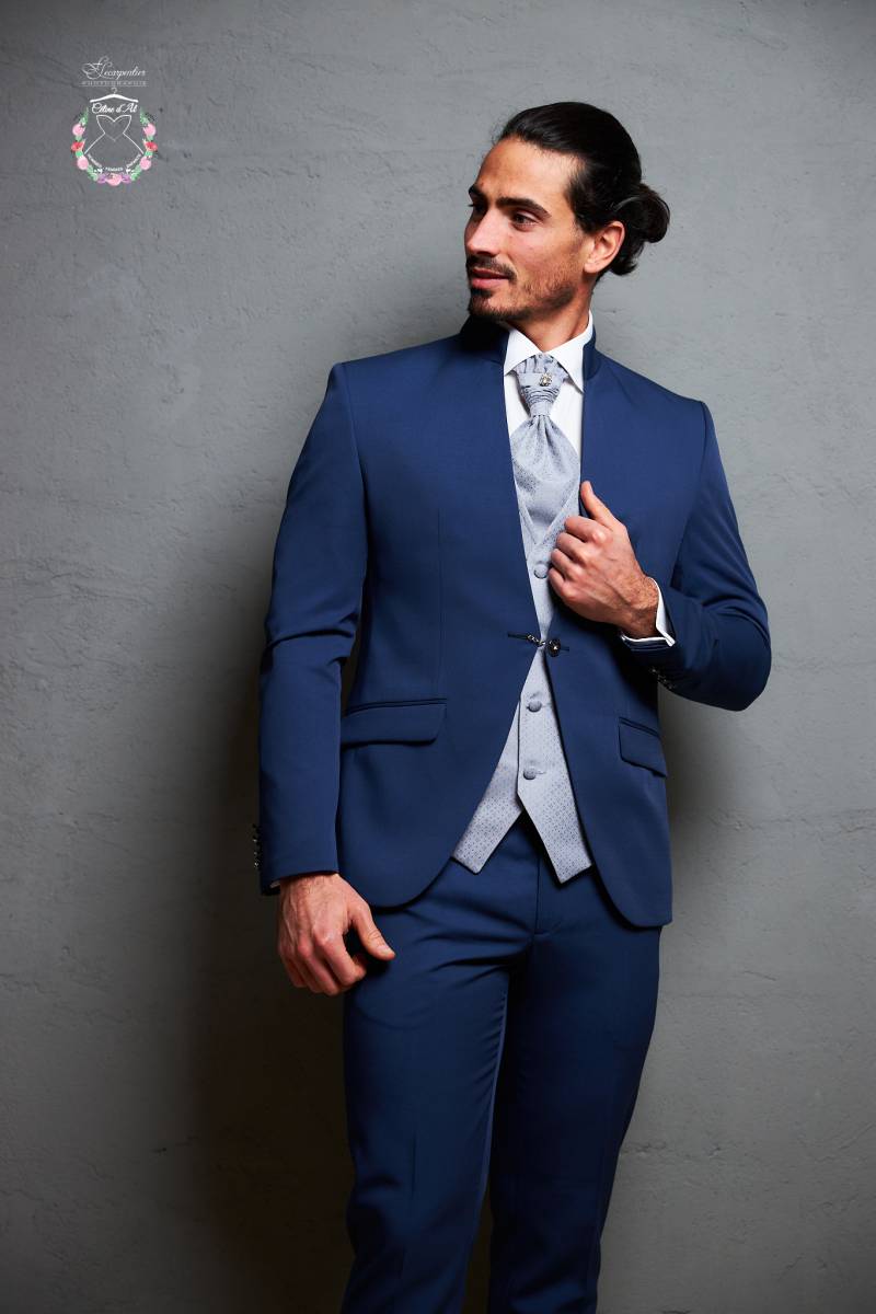Le modèle Veranda Bleu est un costume de cérémonie à col mao.