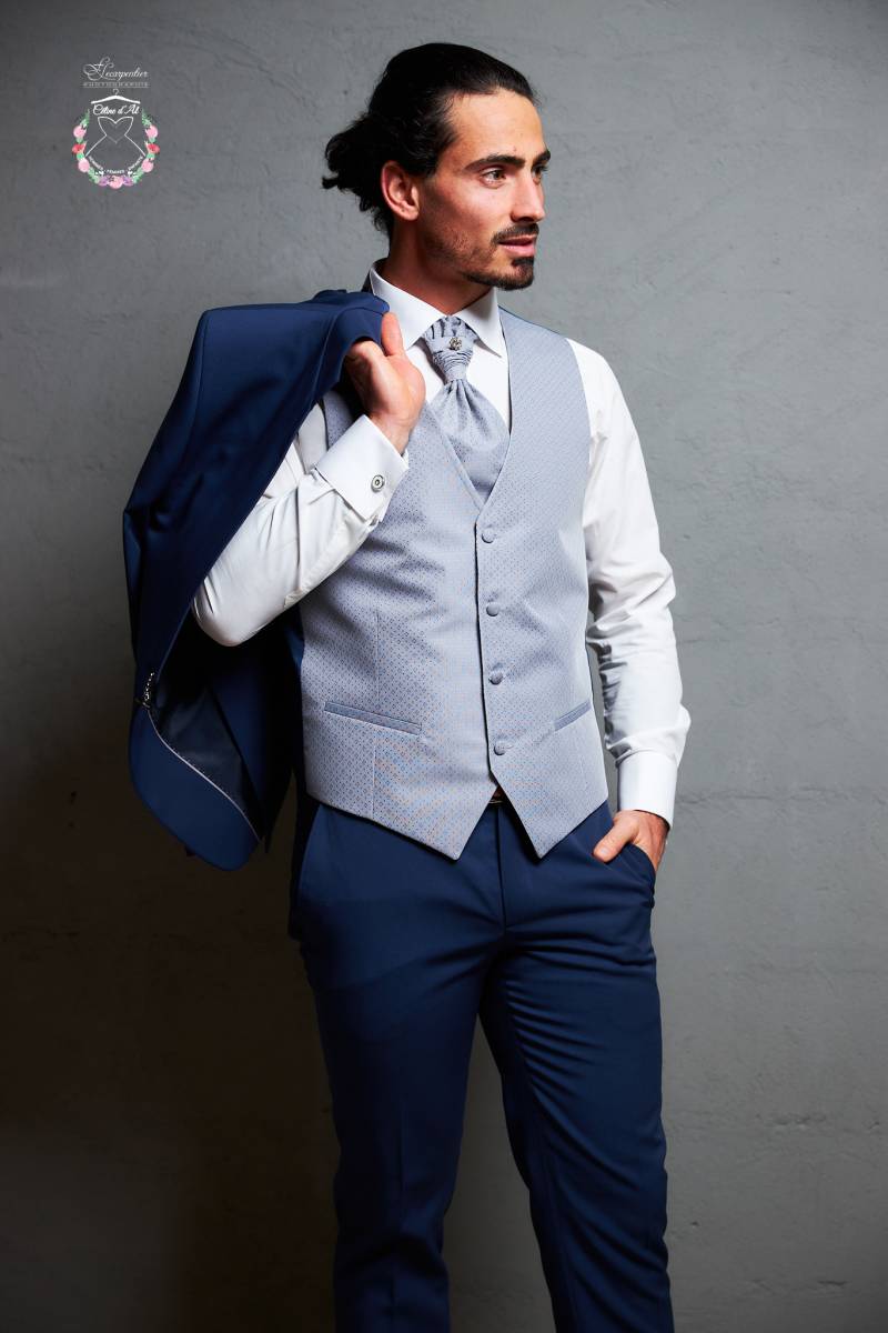De couleur bleu parliament, il vous propose un gilet et une lavallière bleu ciel à motifs.