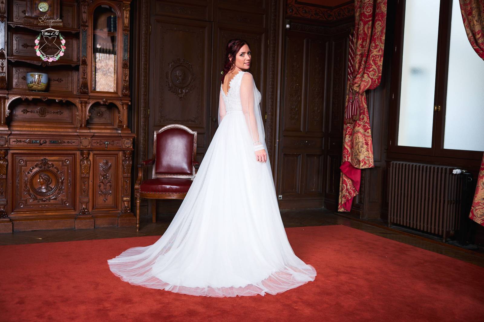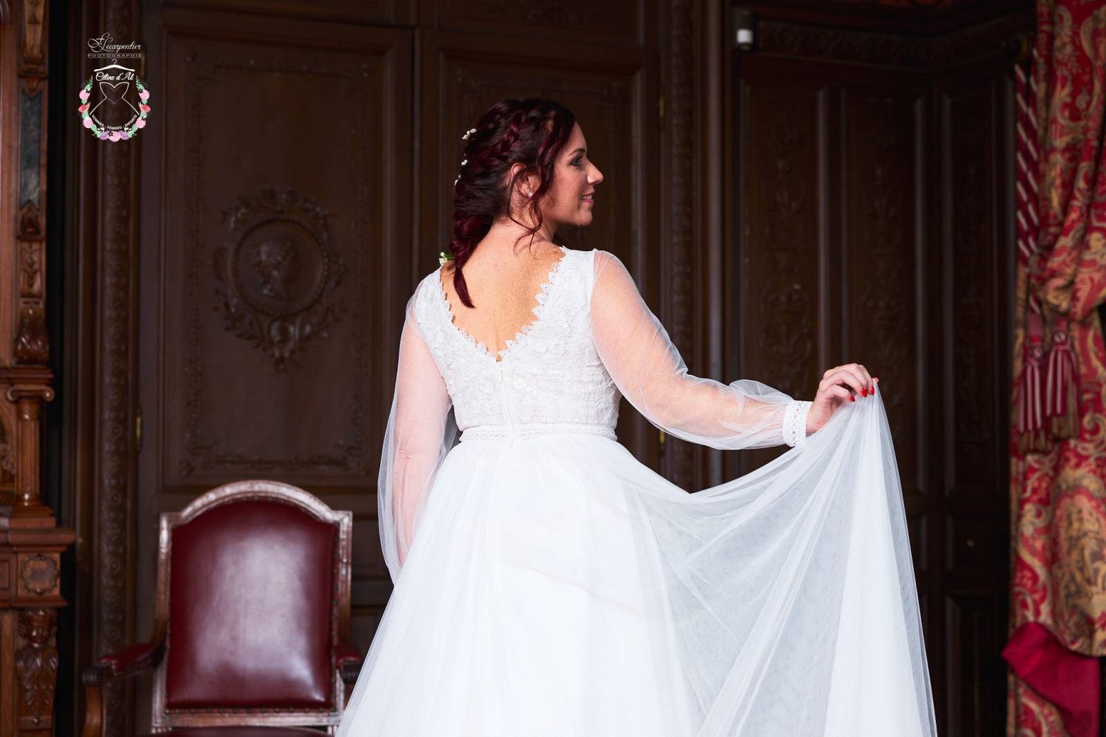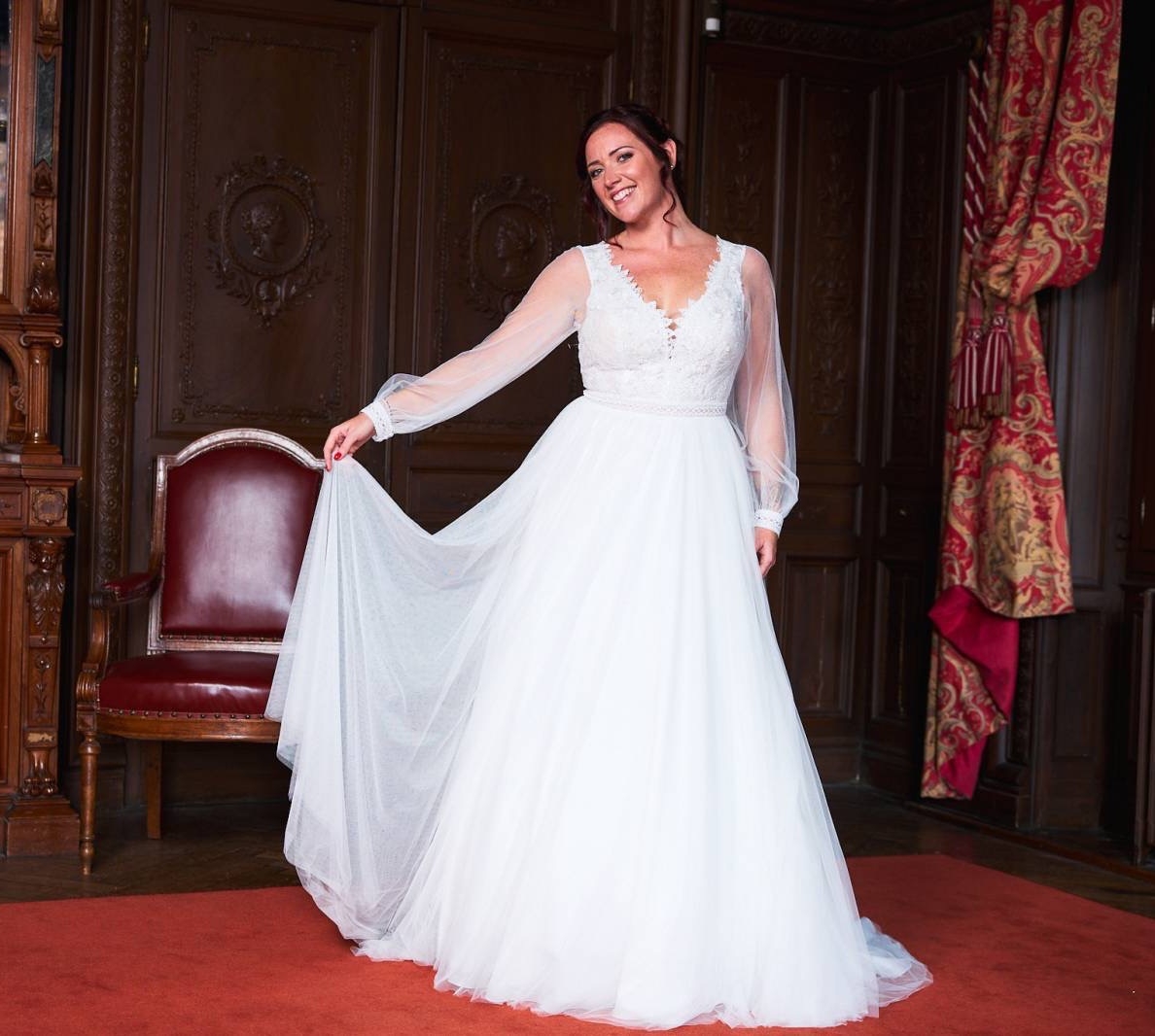 Ses manches bouffantes tout en tulle donneront un effet de transparence et de légèreté à votre tenue. Il est possible de retirer les manches pour celles qui souhaiteraient un buste à bretelles.