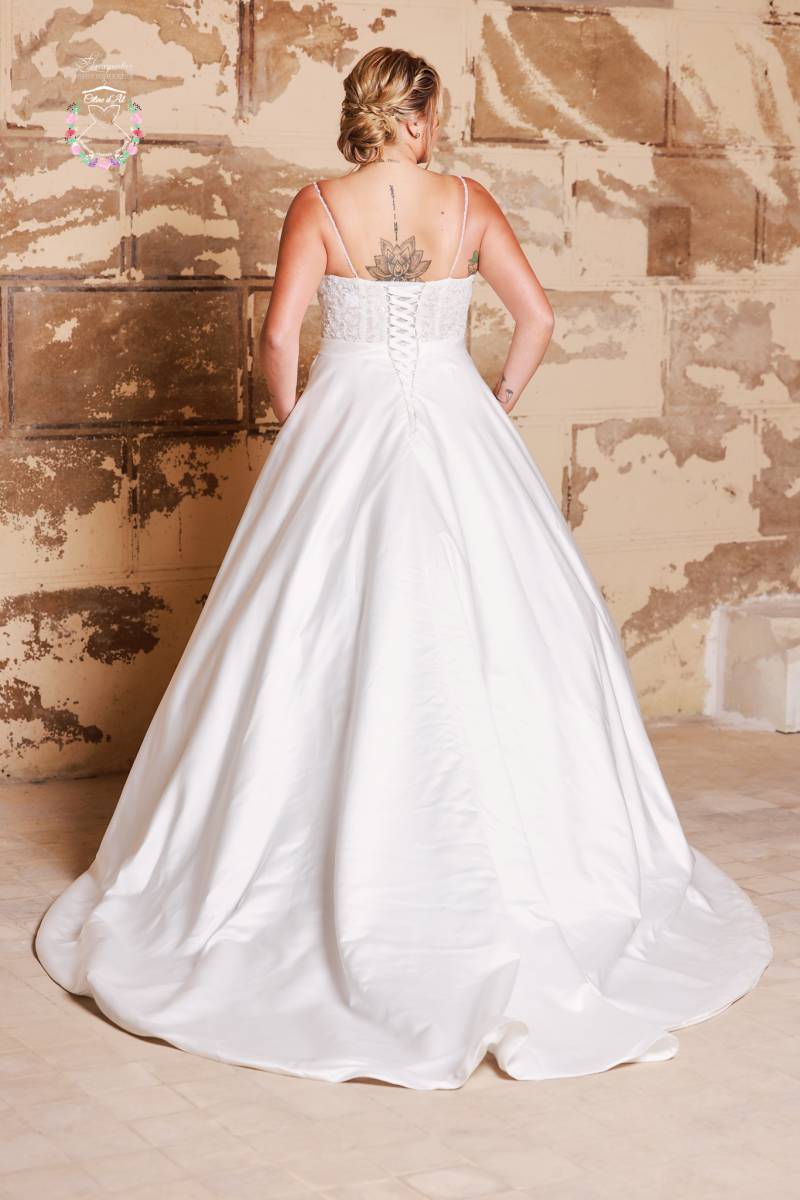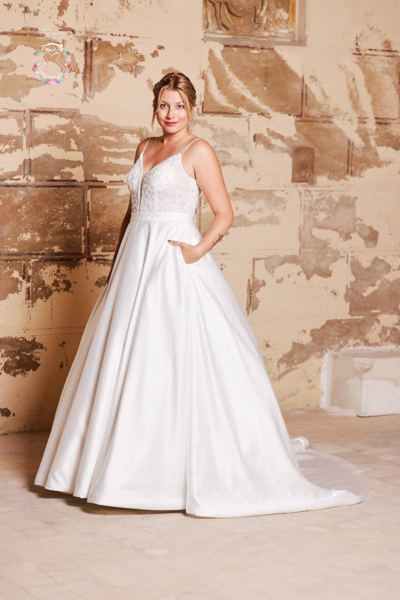 La jupe volumineuse et tout en satin apportera la touche chic et raffinée à votre style princesse avec la particularité des poches, pour une mariée décontractée.