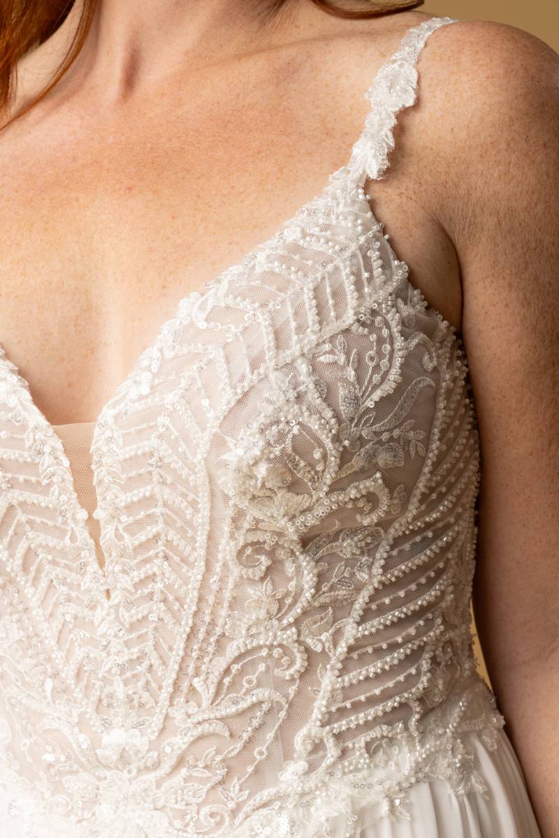 Le modèle Héléna est une robe de mariée à la coupe trapèze et de style champêtre.