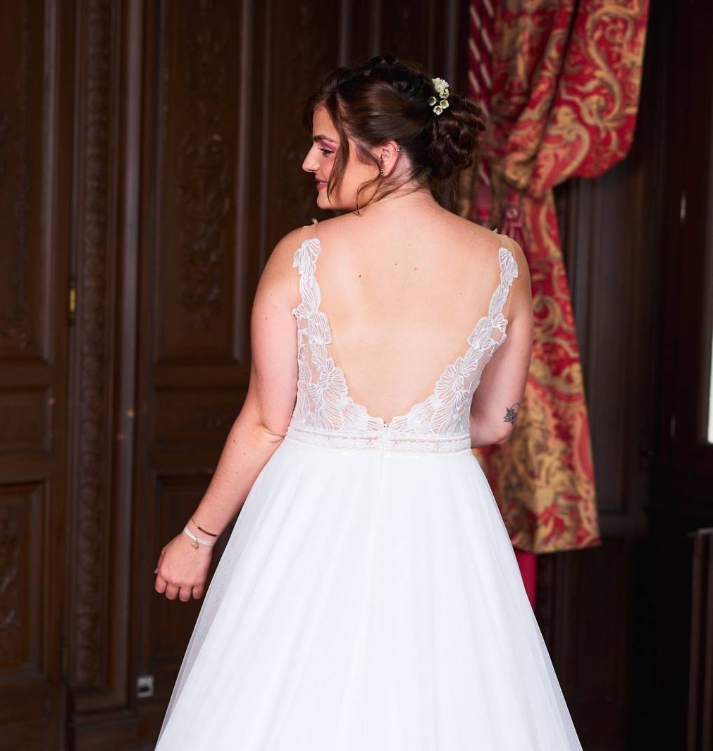 Le modèle Jade-A est une robe de mariée à la coupe trapèze de style bohème et champêtre.