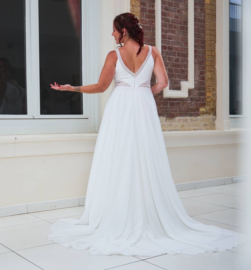 Le modèle Jill-B est une robe de mariée à la coupe trapèze de style bohème et champêtre.
