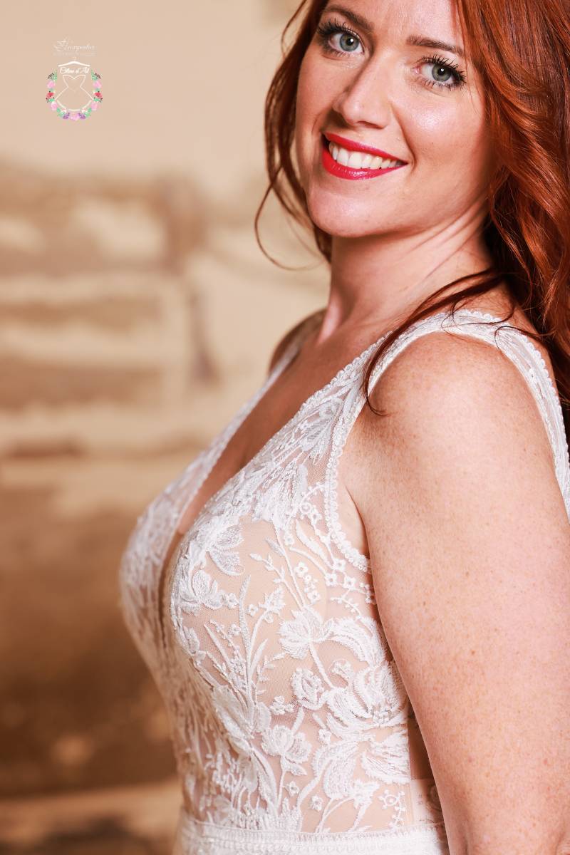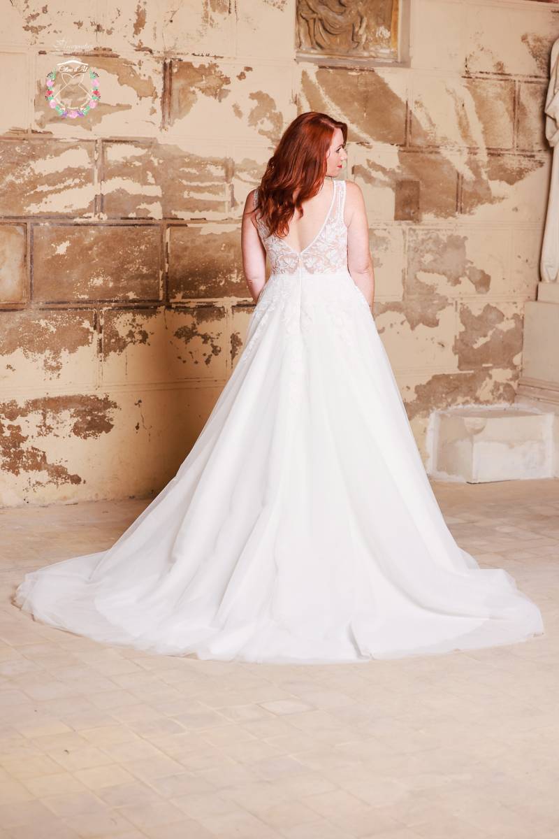 Le modèle Lola-Z est une robe de mariée à la coupe trapèze et de style champêtre.