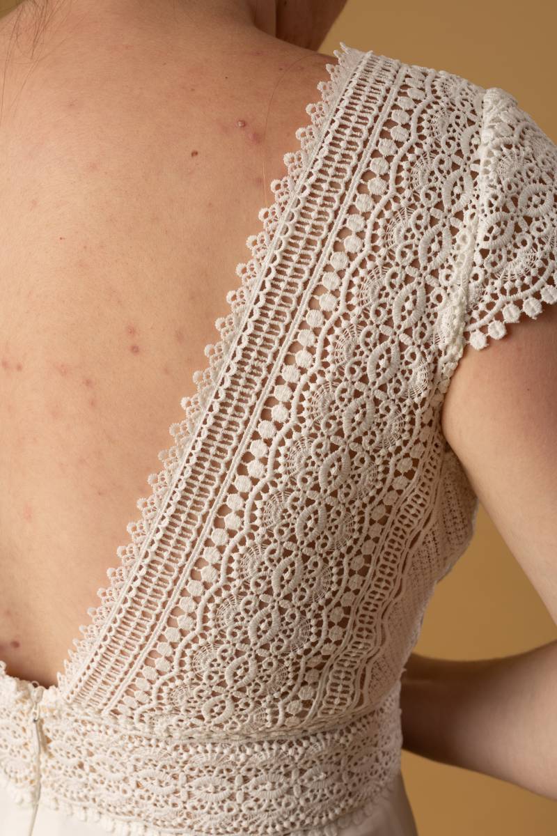 Le modèle Norma est une robe de mariée à la coupe trapèze et de style bohème.