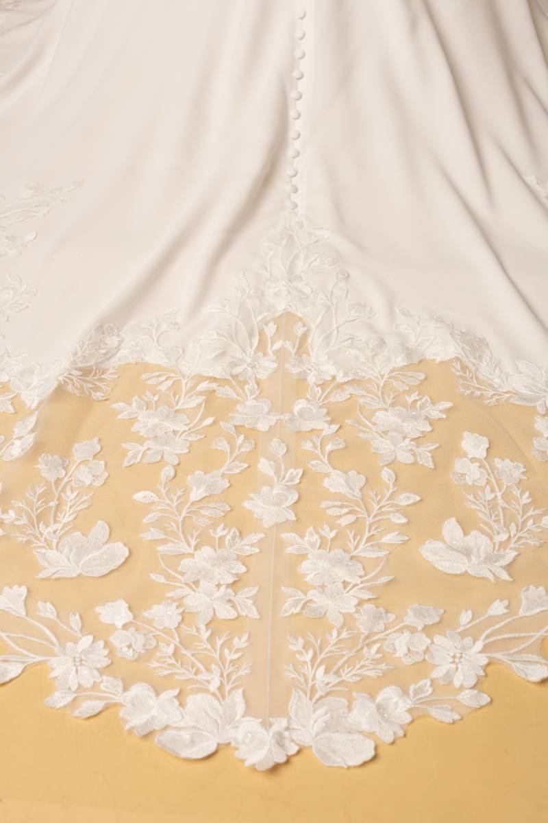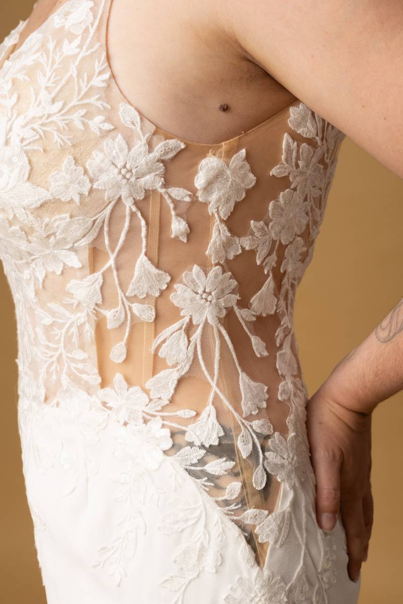 Le modèle Quadisha est une robe de mariée fourreau et de style très travaillé.