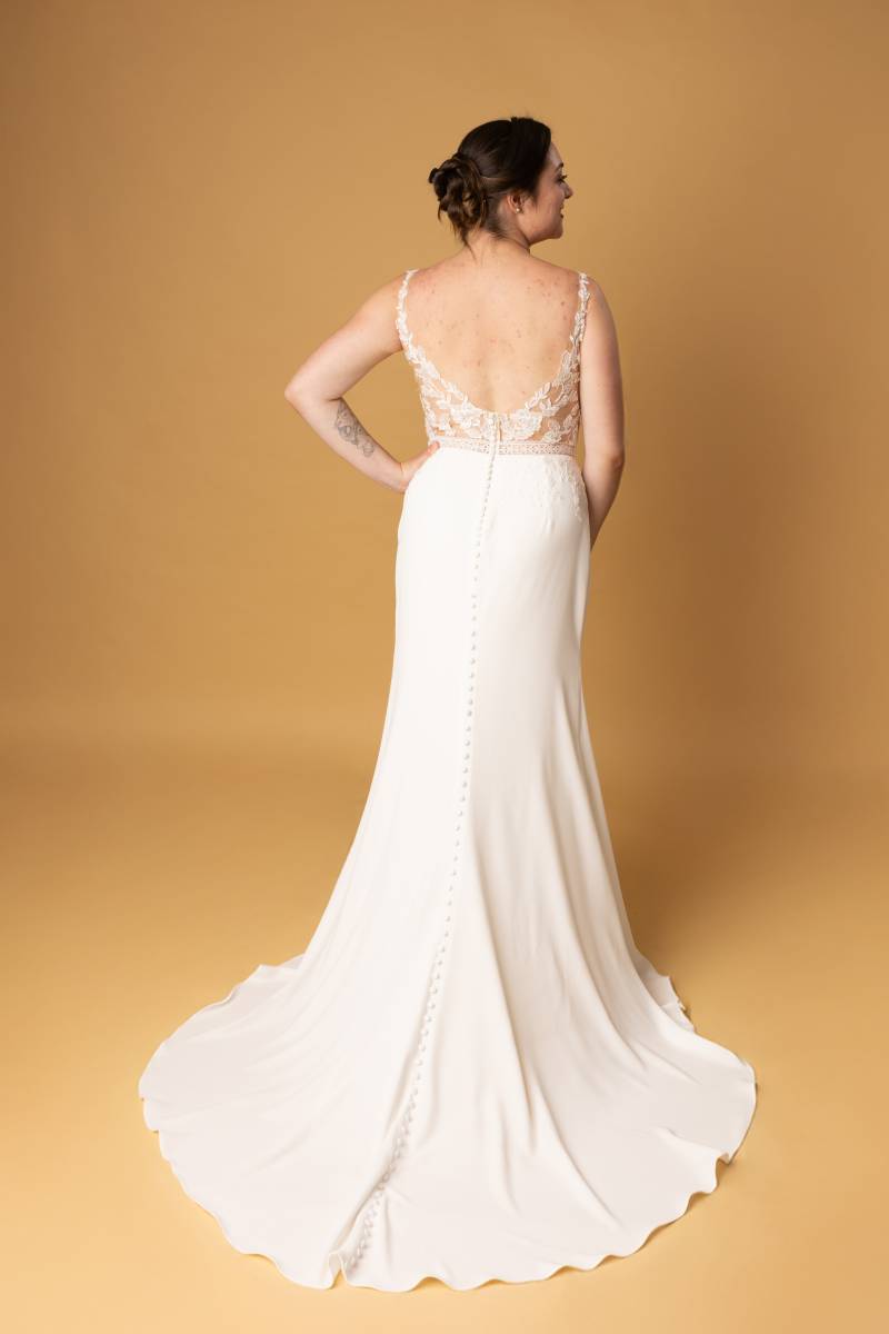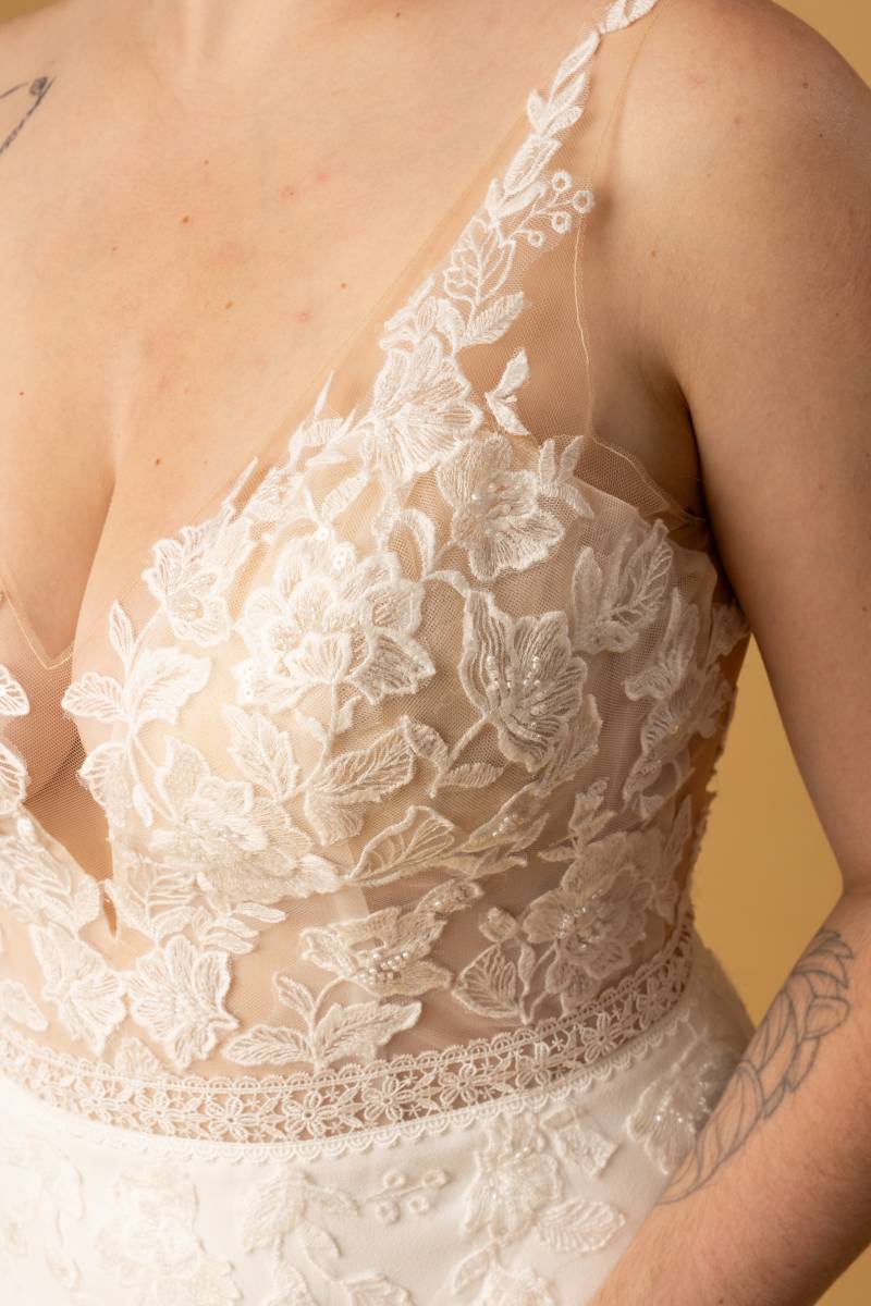 Le modèle Quamar est une robe de mariée à la coupe fourreau et de style travaillé.