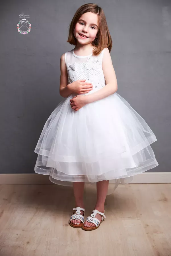 Robe avec jupe en tulle et bas en ruflette de couleur ivoire.