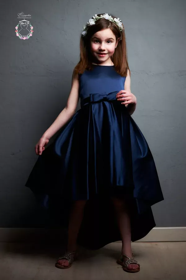 Robe marine satinée courte devant longue derrière.