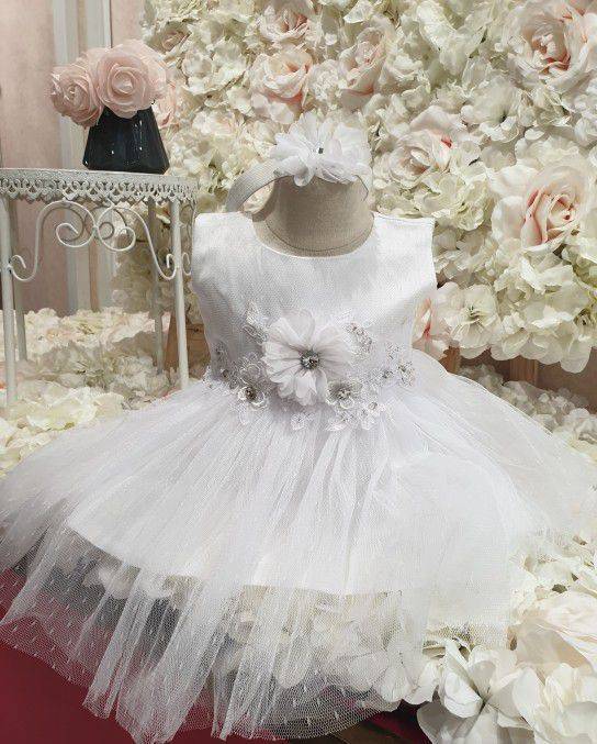 Robe Bébé blanche avec bandeau pour cheveux.