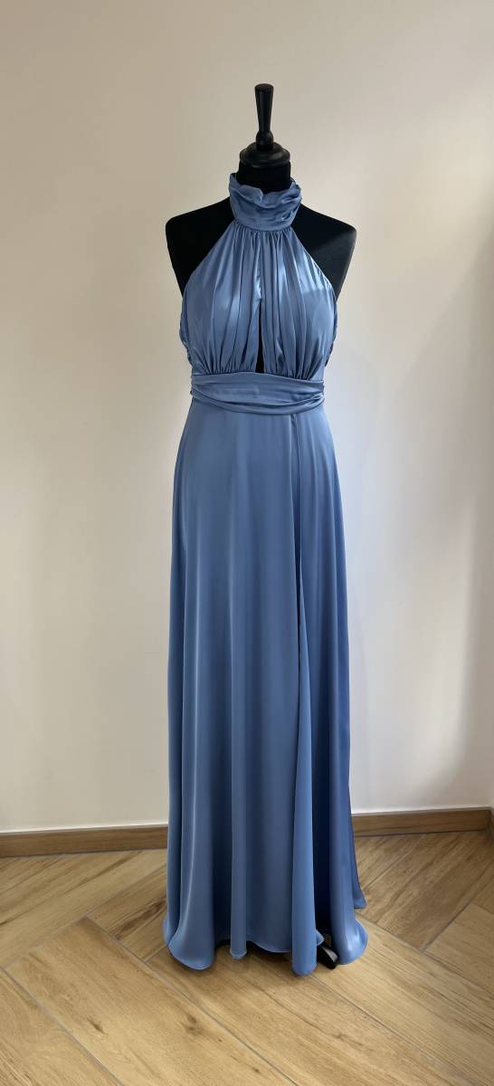 Robe longue en satin marquée à la taille par une ceinture drapée.