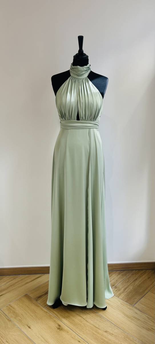 Robe longue en satin marquée à la taille par une ceinture drapée.