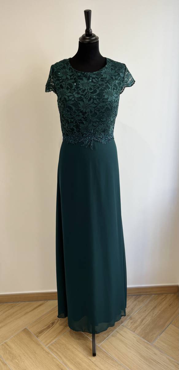 Robe longue verte avec buste et petits bouts de manches en dentelle.