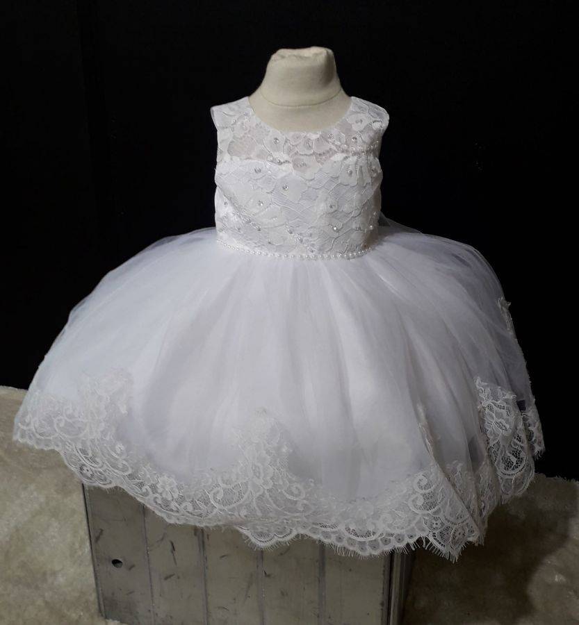 Robe blanche avec incrustations sur le buste et galon de dentelle sur le bas de la robe. Disponible en taille 10 ans.