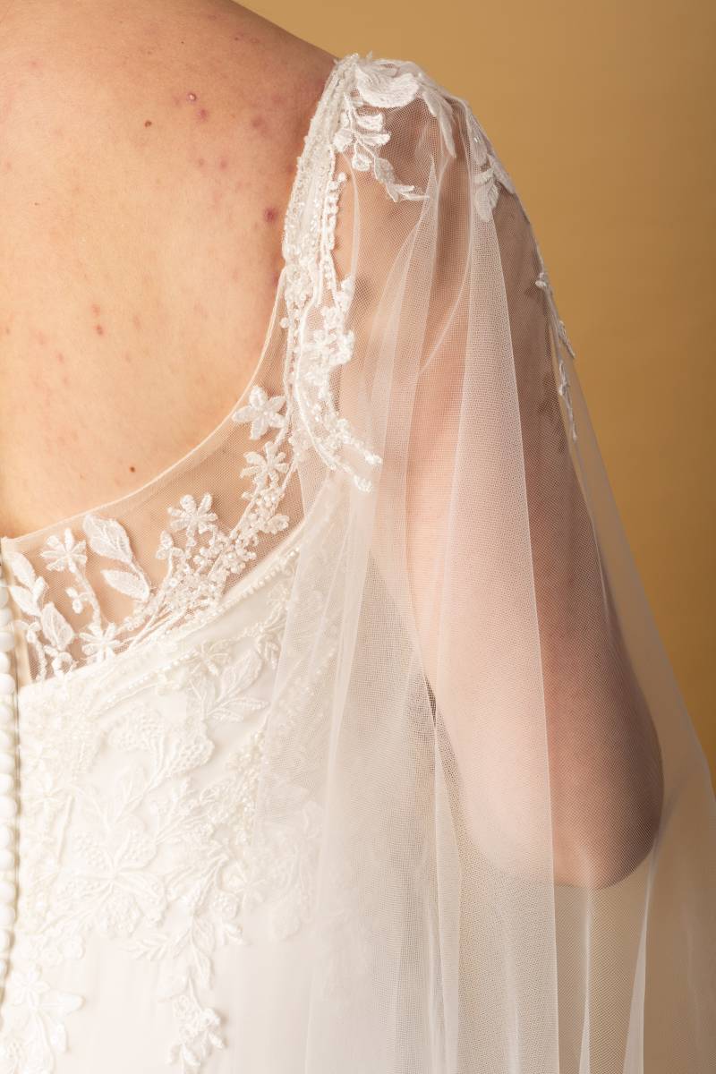 Le modèle Samba est une robe de mariée à la coupe trapèze et de style champêtre.