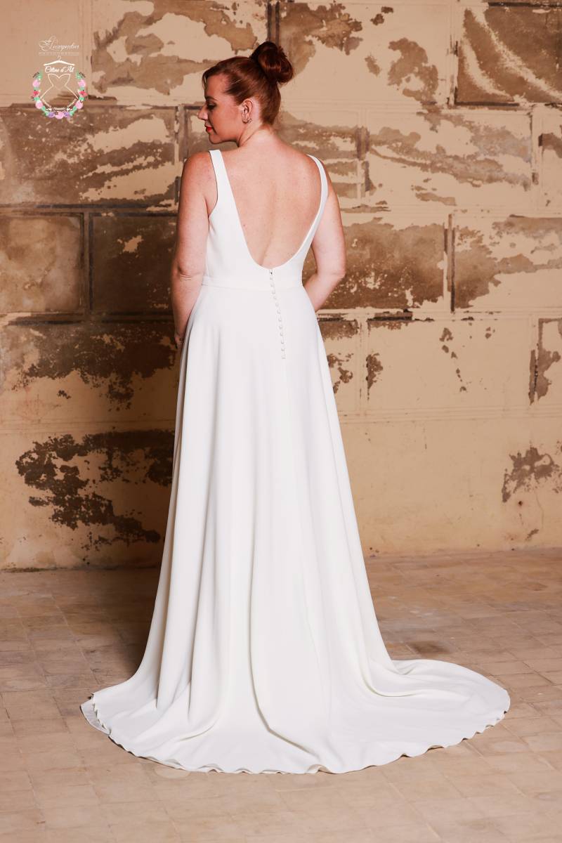 Un magnifique dos ouvert et dégagé avec une finition de boutons recouverts pour une belle chute de reins.