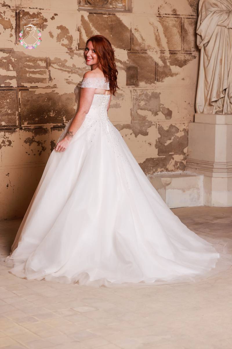 Elle vous propose une jolie encolure bateau pour le côté princesse, mais qui est amovible pour le soir afin que vous puissiez profiter en toute liberté de votre soirée.